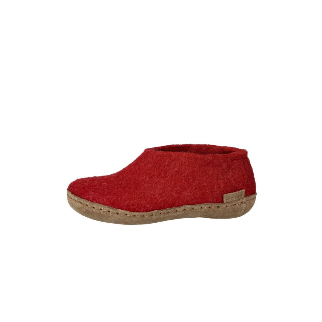 Our junior shoes/slippers are made of 100% pure, natural wool in the classic colour red with a sole of soft and chrome-free calfskin. We started making slippers over 30 years ago - in fact, our founder Nanny Glerup made the first pair of slippers as a declaration of love to her husband Ove.